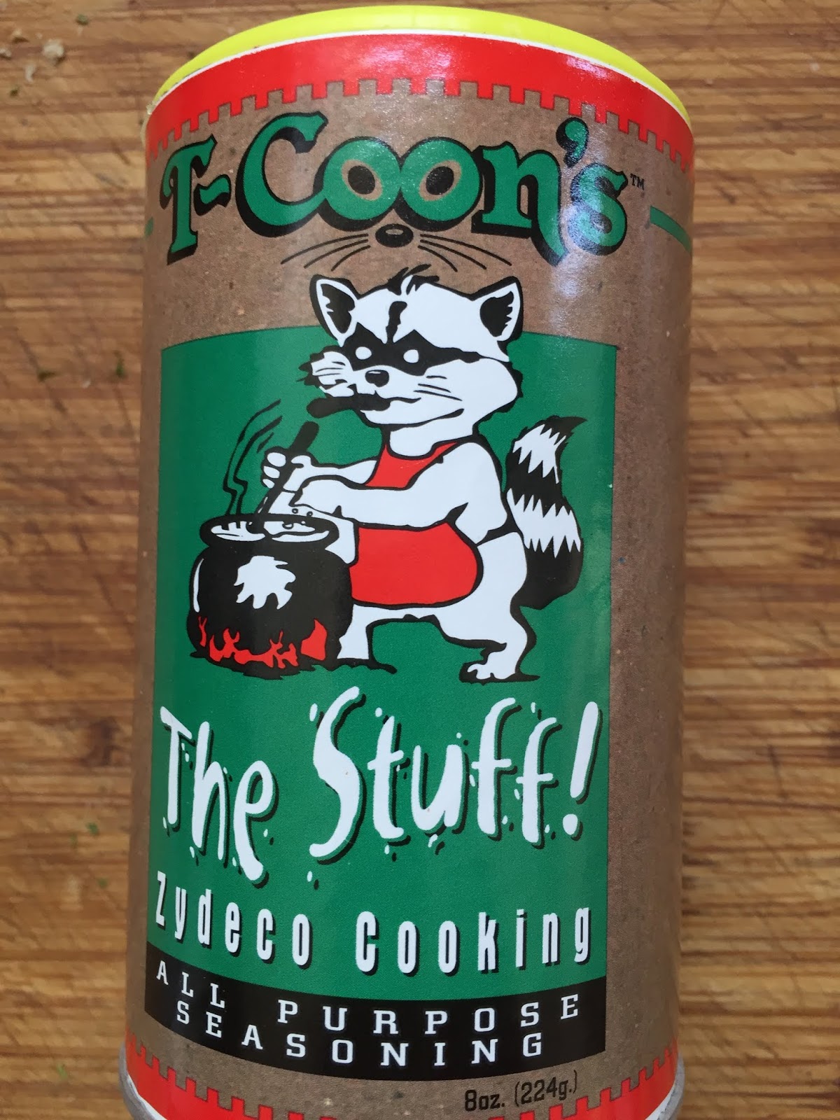 K still wasn't hungry, but she ordered a sausage-and-biscuit combo. The waitress asked her if she wanted pork sausage or a link and I urged the link: that's what we were here for. I was intrigued by the courtbouillon omelet. To me, courbouillon was always (in Cajun cooking: it's a whole different thing in French) a fish stew with a roux-based tomato sauce served over rice. The waitress said it was mixed seafood with a sauce in an omelet. Okay, I'll take it, with a biscuit and grits, which I wasn't going to eat much of. While we waited, I picked up a box of seasoning from the table. It was T-Coon's The Stuff. Okay, I'd seen and used Tony Chachere's Creole Seasoning for years, and on one of my recent visits I'd stopped at the Slap Ya Mama! store in Ville Platte on a Cajun friend's recommendation and bought a box of their seasoning, which was a bit better.
